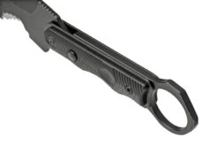 El Civi Orthrus es un cuchillo semifijo único y atrevido. ¿Semi? Sí, claro que sí. El cuchillo se transforma de un cuchillo fijo recto a un karambit inclinando la orientación de la hoja. Sólo hay que pulsar un botón en el mango. Un sólido cierre garantiza que el cuchillo se mantenga en su sitio. Sin fricción. El cuchillo cabe dentro de la funda de Kydex incluida en ambas posiciones. De este modo, podrás llevar el cuchillo de forma segura y sutil en tu pantalón, mochila o cinturón. Ten cuidado al sacarlo de su funda. El cuchillo está mejorado con un afilado de doble cara.