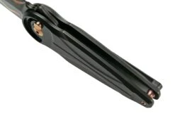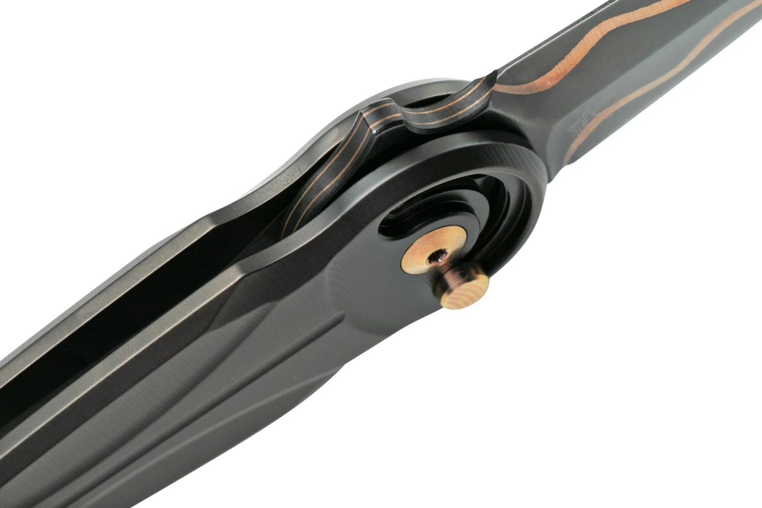Con la Fox Saturn Copper Damascus, una versión especial de la Fox Saturn, Fox demuestra una vez más que pertenece a la cima absoluta de la producción de cuchillos. El fresado del mango es precioso y el acabado es de primera. El Saturn es un diseño de Denis Simonutti. Esto se refleja claramente en el sistema de apertura, ya que se abre el cuchillo con un perno para el pulgar que está incorporado en el mango. Este sistema también bloquea la hoja en posición abierta y cerrada. El Fox Saturn ya ha ganado varios premios. Por ejemplo, ganó «Cuchillo general del año 2021» y «Cuchillo importado del año 2021» en el Blade Show de Atlanta, Georgia.