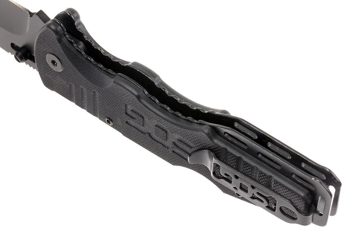 La SOG FF11-CP es una navaja considerable. La hoja está hecha de acero 8Cr13MoV. Tiene una punta larga, que es ideal para las tareas de corte más fino. El revestimiento negro de la hoja le da un aspecto táctico. El mango está hecho de G10 texturizado, por lo que se puede conseguir un buen agarre incluso con las manos mojadas. Se puede abrir fácilmente el cuchillo con una sola mano. Una característica distintiva de este cuchillo es la opción de colocar el perno del pulgar tú mismo. Esto significa que puedes ajustarlo al tamaño de tu propia mano, para que puedas alcanzarlo perfectamente. Cuando se abre, la hoja se bloquea mediante un sólido cierre trasero. El clip de bolsillo está colocado con la punta hacia arriba y puede colocarse tanto para zurdos como para diestros.