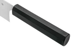 El cuchillo Spyderco Nakiri de la colección Murray Carter Minarai es impresionante en toda su simplicidad. Nakiri significa «cortador de verduras». Su forma única y rectangular hace que este cuchillo sea perfecto para cortar todo tipo de verduras. La punta del cuchillo es ligeramente redondeada para que también puedas cortar rápidamente verduras en ángulo. Además, podrás cortar hierbas en porciones minúsculas con gran facilidad.